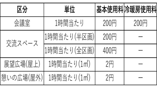 ※交流スペース、展望広場及び憩いの広場の施設使用料は、貸切で使用する場合の料金です。休憩等でのご利用は無料です。